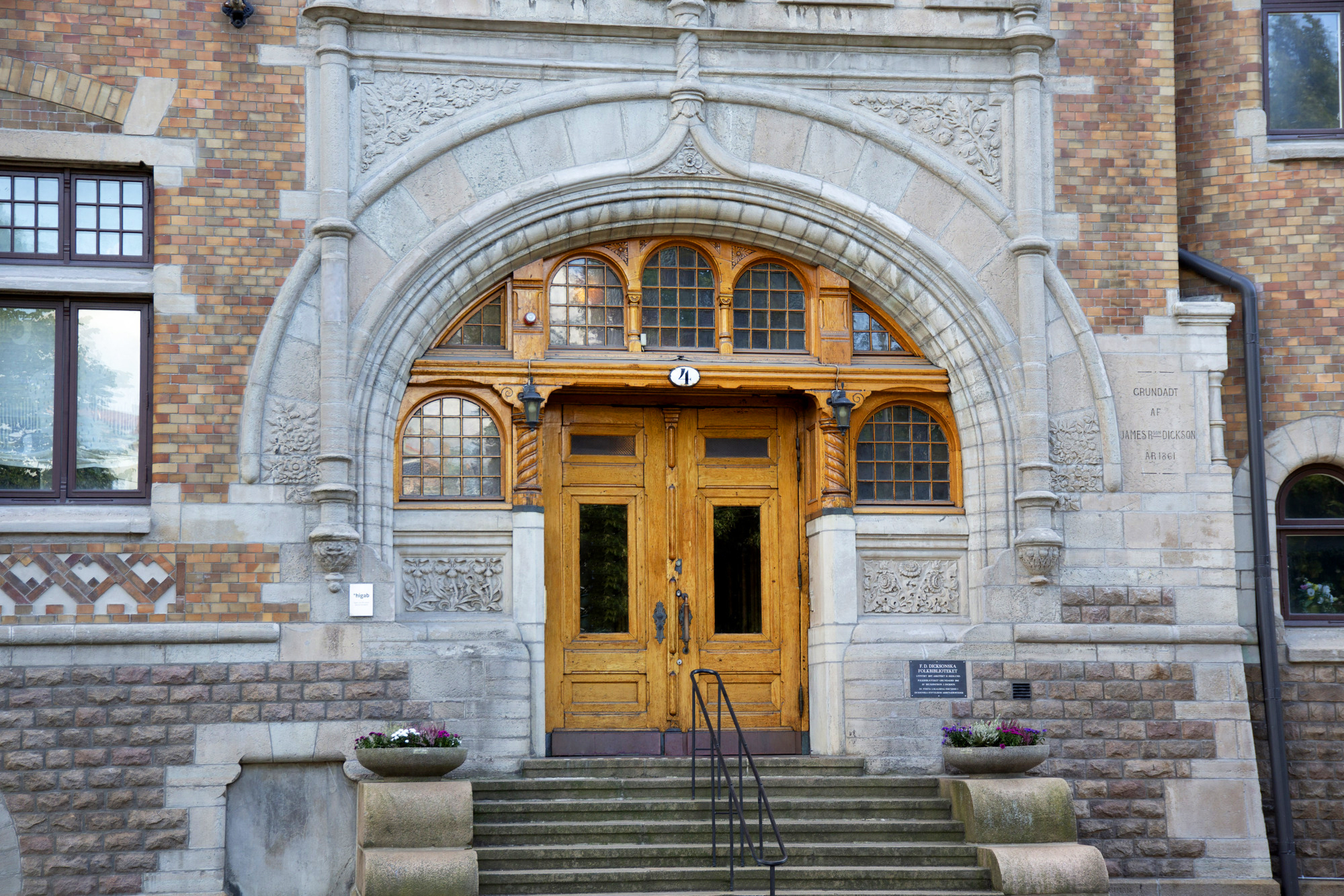 Biblioteket uppfördes med en villaliknande karaktär med olika fasadmaterial och varierande former. Sockeln är av grovhuggen ljus bohusgranit med kraftiga rundbågsöppningar. Fasaderna är klädda med gulbrunt skrombergategel och försedda med detaljer av grå kalksten. Huset fick även ett hörntorn med konisk huv och skiffertak. Förutom biblioteksutrymmena inreddes bostäder på övervåningen för vaktmästaren och föreståndarinnan.