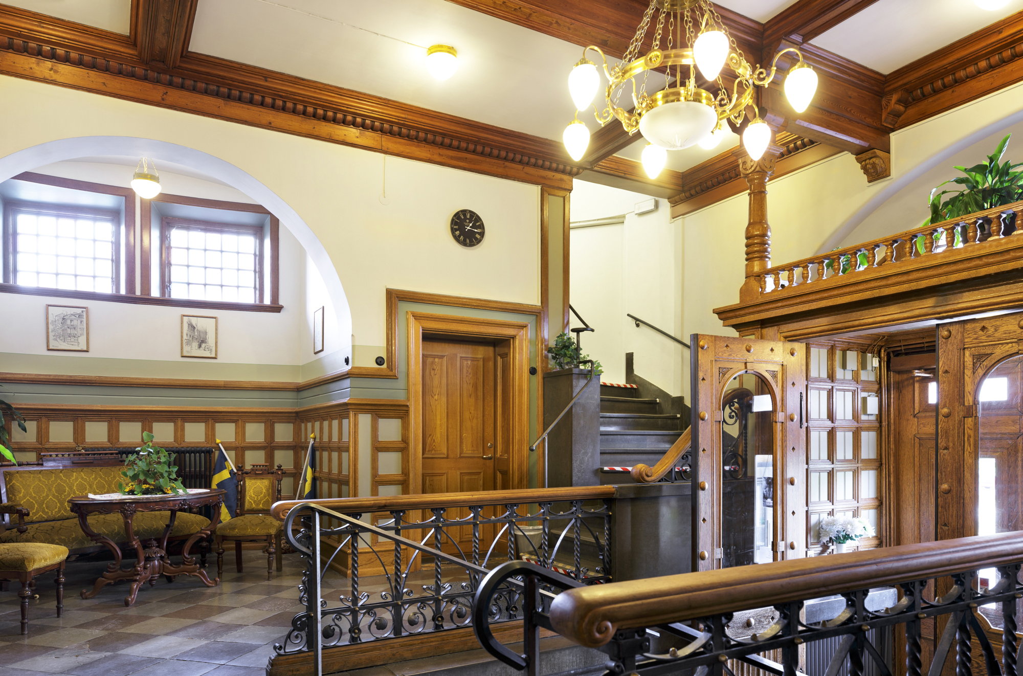 Byggnaden har delvis bevarad ursprunglig planlösning. På första våningen har det stora bokmagasinet delats av med ett sekundärt bjälklag och i tidningssalen finns en balkong utmed de inre väggarna. Golv, snickeridetaljer och dörrar har bytts ut i stora delar av huset och ytskikten är i regel senare. Entréhallen och trapphuset samt läsesalen mot Allégatan är dock välbevarade med ursprungliga dörrar och snickerier. Allégården blev byggnadsminne 2011.