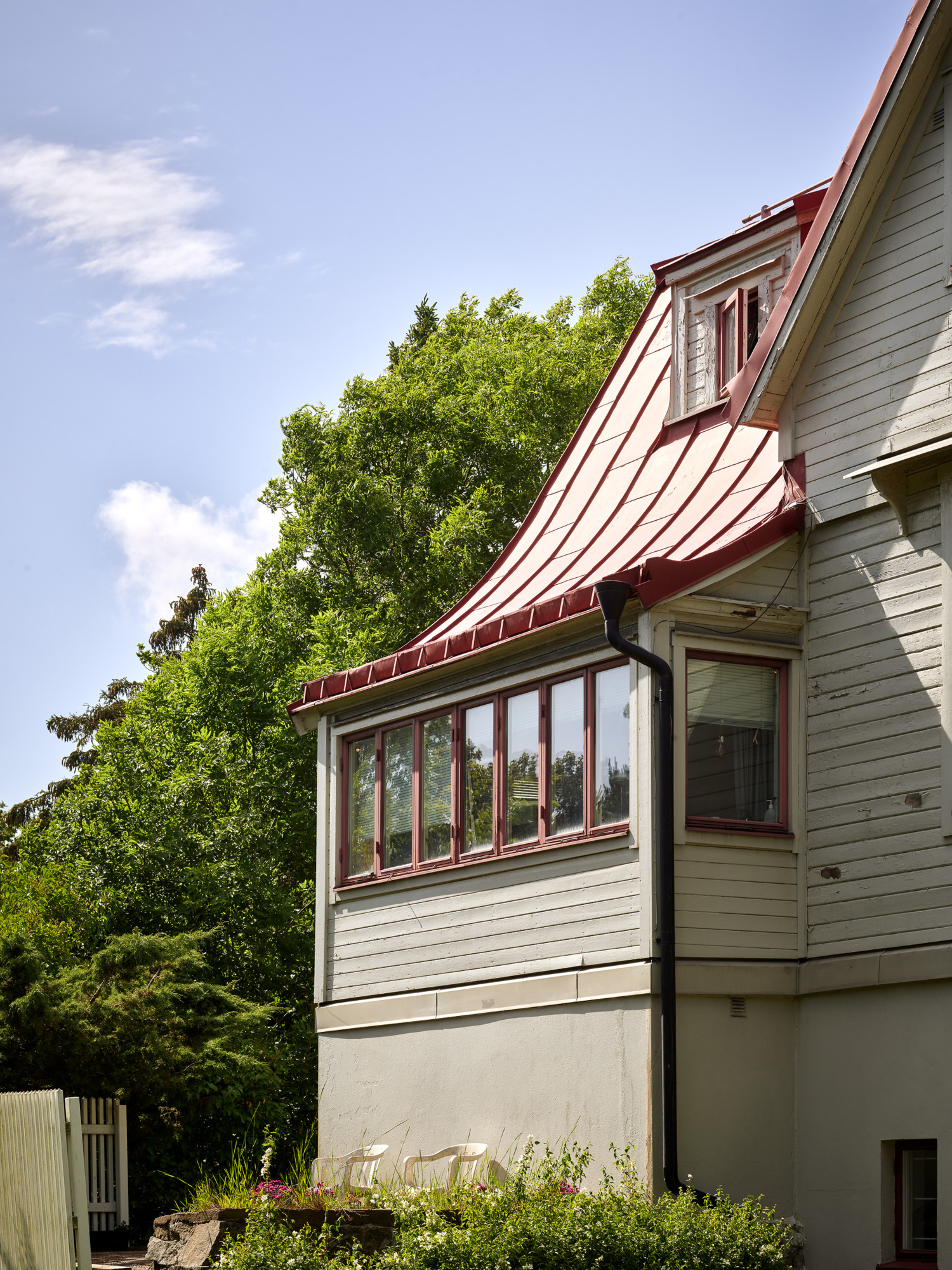 Huset är utformat i två våningar med en inredd vind. Fasaden har en ljusbeige kulör och det branta taket är i röd falsad plåt. Bottenvåningen består av spritputsad sten och övervåningen är en träkonstruktion med liggande träpanel.