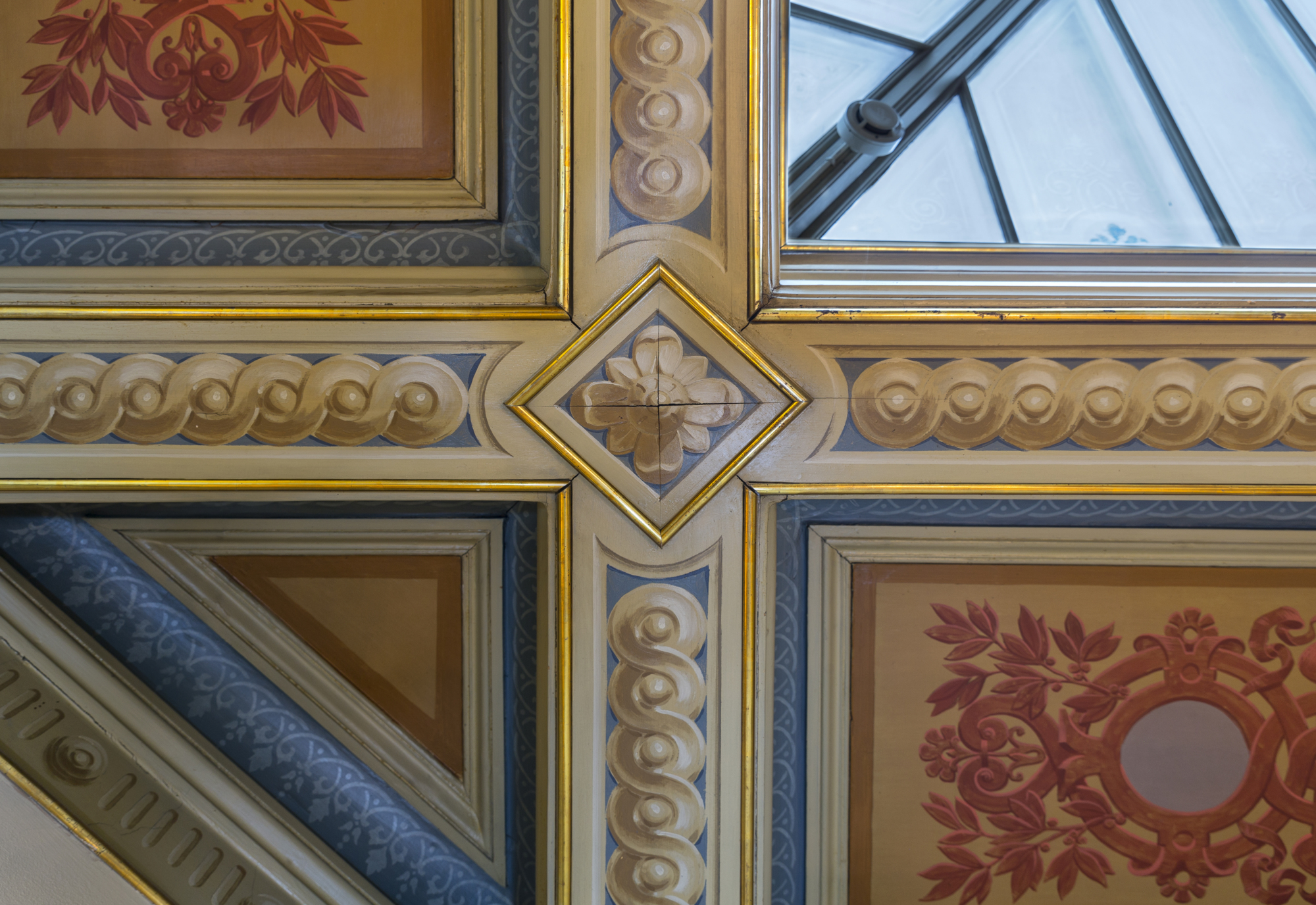 Taket i vestibulen är rikt dekorerat med målningar och stuckaturer. Ingången har välvt tak med målad bladornamentik. Även sällskapsrummen är rikt utsmyckade med friser, målningar, gyllenlädertapeter och paneler i ek och valnöt. I matsalen finns målade fönsterglas och huset är också försett med flera vackra kakelugnar. Största delen av källarvåningen var från början inredd som laboratorier åt Gegerfelts son Harald, som var kemist. Här fanns även visthus, strykkammare och brygghus.
