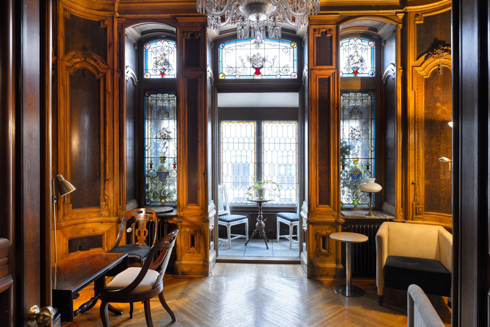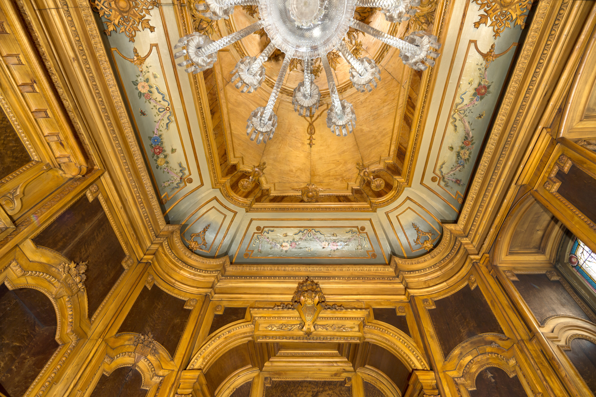 Från tamburen leder en trappa upp till första våningen och en åttkantig hall eller vestibul som sträcker sig upp genom hela huset och avslutas med ett glastak i yttertaket. På denna våning fanns även förmak, kök, matsal, salong och pigkammare. På övre våningen fanns familjens sovrum, badrum och handkammare.