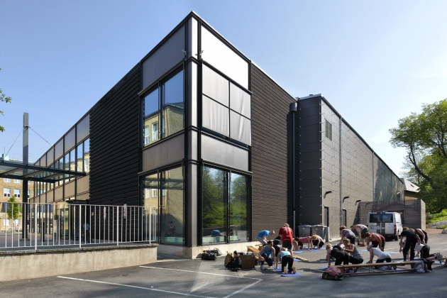 Anläggningen har en bärande stålkonstruktion och omfattar tre plan på sammanlagt 3 500 kvadratmeter, där den flexibla idrottshallen upptar 1500 kvadratmeter. Hallens fasad är av fibercement medan fasaden mot söder är klädd med ett rostfritt nät där växter ska kunna klättra. Övriga fasader är i huvudsak av trä. Entrén domineras av ett glasat skärmtak, 25 meter långt och 5 meter brett som står på pelare.