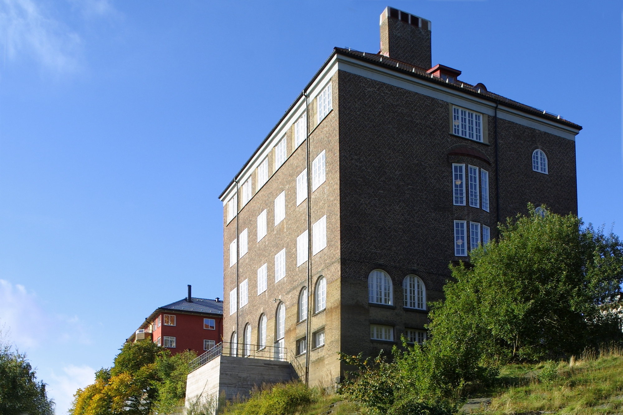 Huset ligger direkt på berget, med sockel i betong och fasader klädda med handslaget, rödbrunt tegel. Skolan kom att kallas Annexet, men i folkmun blev det bara ”Mjölkflaskan” på grund av byggnadens form med de tornliknande ventilationshuvarna på taket. Stilen är nationalromantisk. Karaktäristiska detaljer är vita smårutsindelade fönster, burspråk, mönstermurade partier i fasaden och rundbågade träportar. På fasaden över entrén sitter en klocka av järn som också är ett solur.