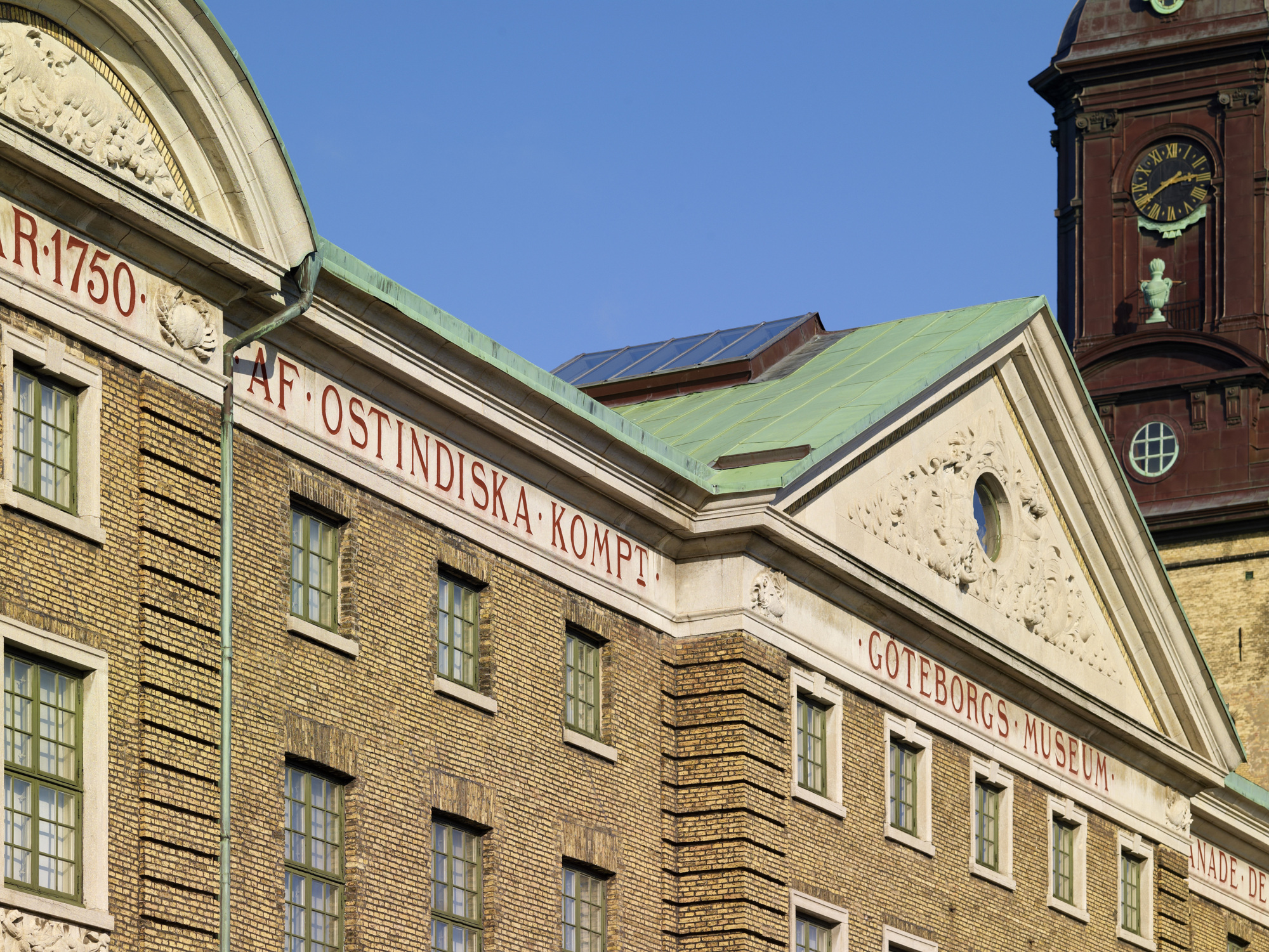 Ett par år senare upprättade samma arkitekter ritningarna för att modernisera den äldre delen av huvudbyggnaden. Mot Norra Hamngatan kläddes bottenvåningen med nytt tegel och de övre våningarna dekorerades med kalkstensreliefer. Vid gården höjdes den översta våningen och ett större fönster togs upp. Huvudentrén fick en monumental utformning med jugendinspirerad växtornamentik på kolonner och valvbågar. I samband med ombyggnaden tillkom den välkända texten under takfrisen: ”Byggnaden restes år 1762 af Ostindiska Kompt. Göteborgs museum omdanade densamma år 1895 för sina samlingar”.