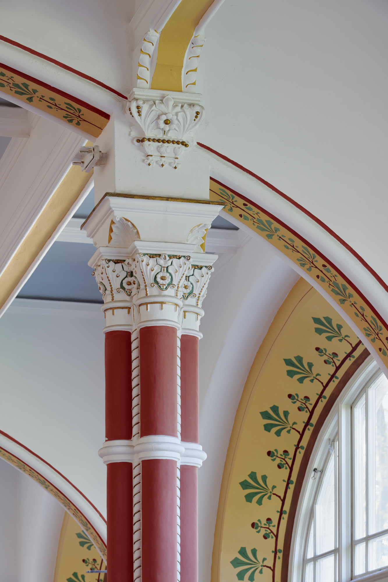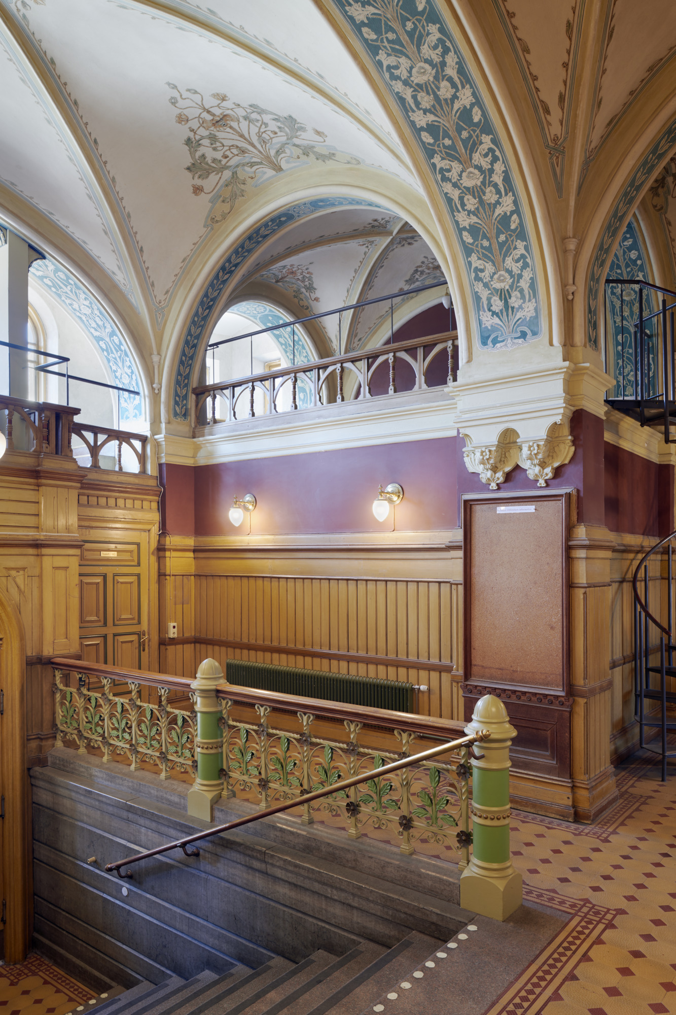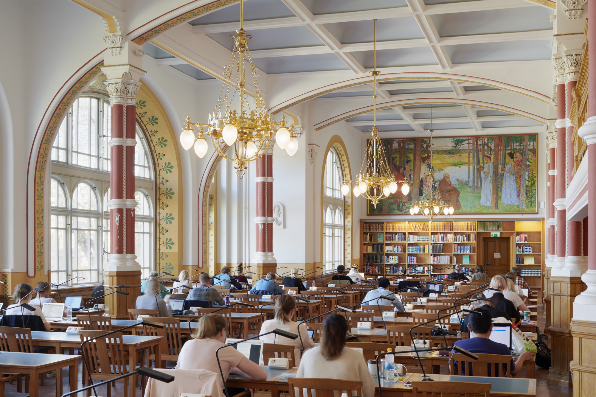 I huvudvåningen placerades expedition och läsesalar, inklusive den stora läsesalen som smyckades med tidstypisk dekormålning. På fondväggen finns Carl Wilhelmsons konstverk ”Allegori över bildningen” som bekostades av Pontus Fürstenberg. Även entréns väggar och valv dekormålades. De övre våningsplanen var lägre och utformades som magasin. Vid öppningen hade biblioteket cirka 7 000 hyllor med drygt 80 000 böcker. Tidningar förvarades i källarvalven och boktransporter mellan våningsplanen sköttes med en hiss.