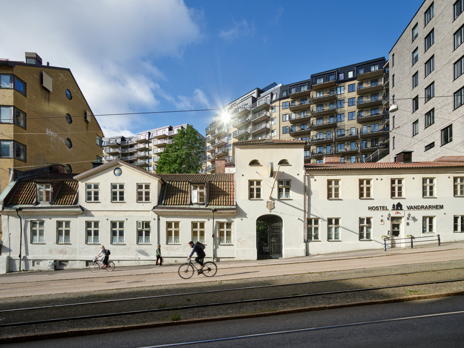 Östra delen av huset på Stigbergsliden byggdes 1831 som friliggande enplanshus. Senare tillkom ett hus mot väster. 1854 köptes fastigheten av Göteborgs Sjömanshus och i början av 1900-talet byggdes husen ihop och ett torn uppfördes över den nya porten. 1961 upphörde Sjömanshusets verksamhet. Ändrade villkor och sociala förändringar gjorde att behovet av sjömanshusen avtog. Huset vid Stigbergsliden stod länge tomt eller användes tillfälligt för olika verksamheter, men 1996 byggde Higab om det till vandrarhem.