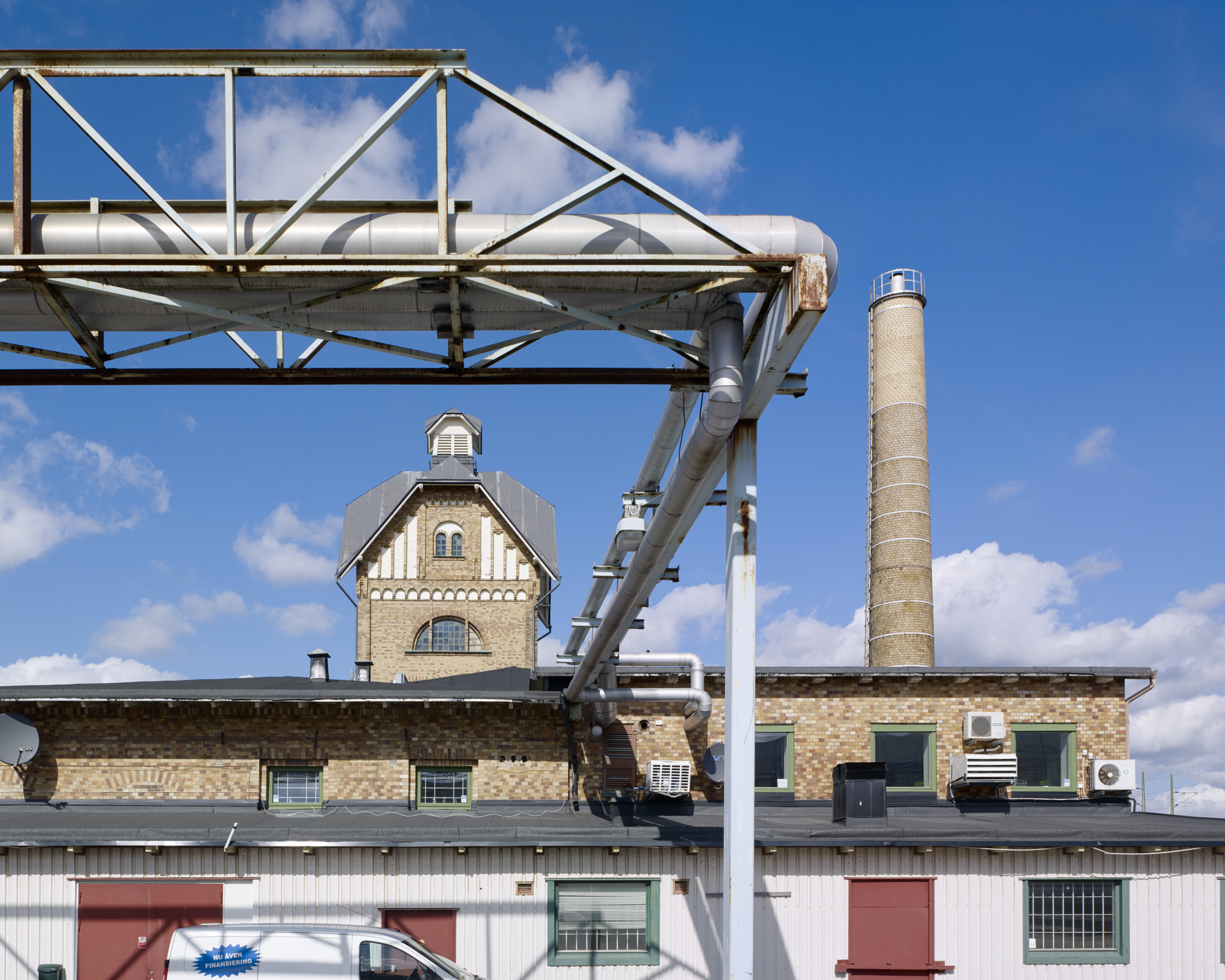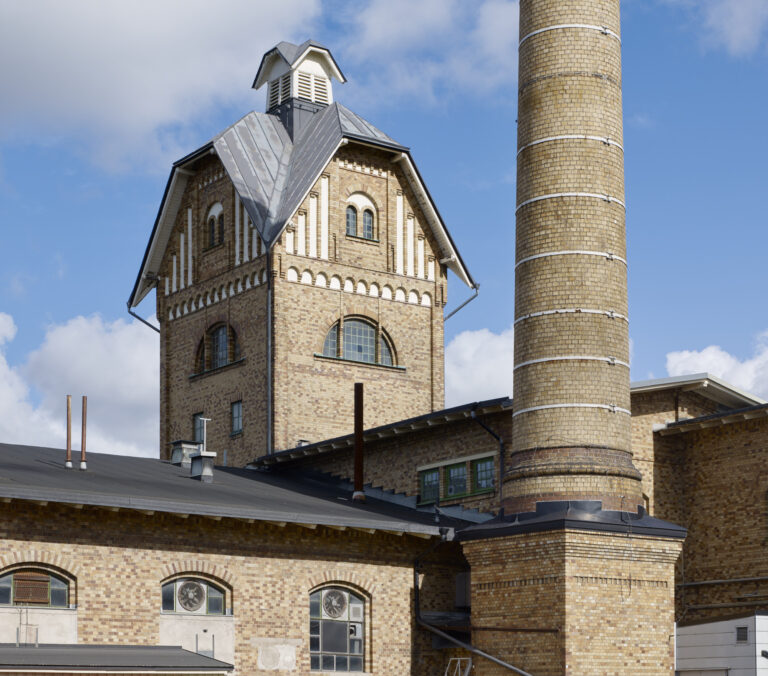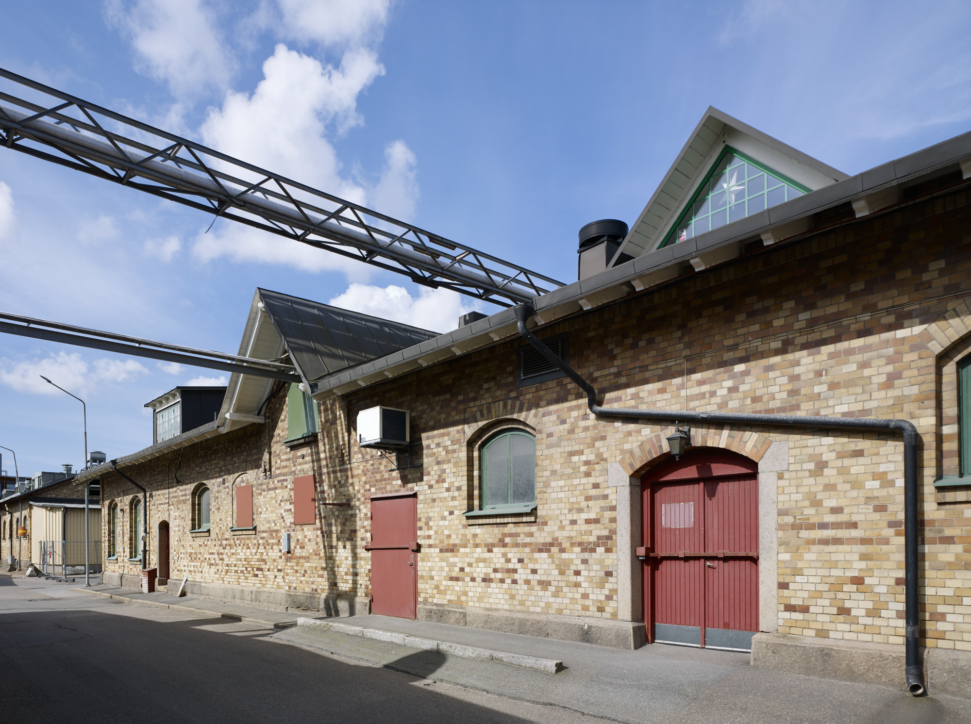 Fasaderna är i gulbrunt tegel med murade mönster och inslag av ljusa putspartier och natursten. Huvudbyggnaden har en kalkstensportal med dekor i form av stadens vapen och ett djurhuvud. Karaktäristiskt för området är det 23 meter höga kyltornet och den närliggande 30 meter höga skorstenen som hörde till områdets ångpanne- och maskinhus.